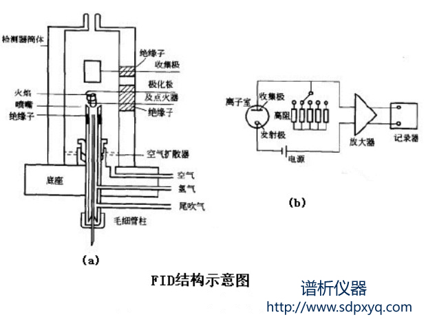 气相色谱仪FID的主要部件是离子化室,内有正极和负极构成的电场,由氢气在空气中燃烧构成的能源以及样品杯载气带入氢火焰中燃烧的喷嘴。