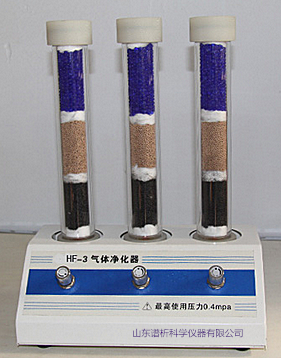 由于水分、烃类和氧气会对色谱分析造成较为明显和严重的影响,气相色谱中常用的气体净化装置一般包括三种:除水装置、除烃装置和除氧装置。水分存在于气体容器的表面和气路管路内,其不仅影响组分的分离,还会使部分固定相或硅烷化担体(甚至包括某些样品)发生水解,缩短色谱柱的寿命,产生基线噪音和拖尾现象。氧的破坏作用最严重,即使很微量的氧也会破坏毛细管柱以及极性填充柱,氧会使固定相氧化,从而破坏色谱柱性能和色谱柱寿命,改变样品的保留值;氧化物还会引起基线噪声和漂移,并随着柱温的升高破坏性急剧增大,对特殊检测器以及高灵敏度检测器样的破坏作用更加明显,尤其是TCD和GC-MS,氧会直接烧毁热丝和灯丝。气体中有机化合物(烃类)或其它杂质的存在则会产生远高于正常的基线噪音和鬼峰,影响痕量和微量组分的判定。