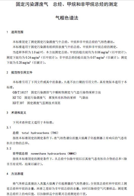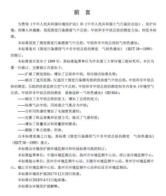为贯彻《中华人民共和国环境保护法》和《中华人民共和国大气污染防治法》,保护环境,保障人体健康,规范固定污染源废气中总烃、甲烷和非甲烷总烃的测定方法,制定本标准。本标准规定了测定固定污染源废气中总烃、甲烷和非甲烷总烃的气相色谱法。