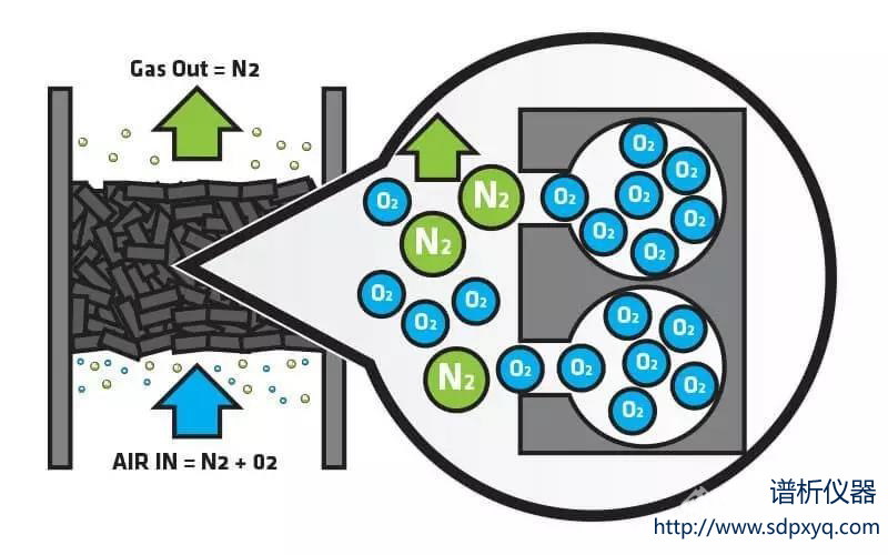 变压吸附制氮的填充材料是碳分子筛,是一种多孔疏松的棒状碳颗粒,当压缩空气通过碳分子筛时,同样也是根据气体分子直径的不同,碳分子筛会吸附水汽和氧气,但是,氮气不会被吸附,从而被分离。变压吸附的过程包括吸附解压-重生阶段。