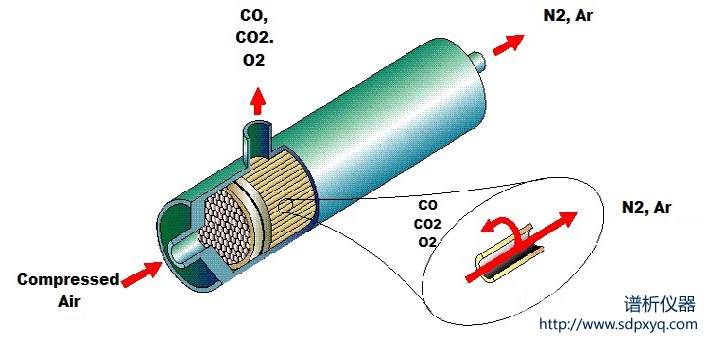 压缩空气通过中空纤维膜,由于不同气体分子直径不同,当空气通过膜的时候,分子直径较小的氧气、二氧化碳和水蒸汽会通过中空纤维膜管道上的小孔,进而排到大气中去。在膜的出口,大分子直径的氮气分子和惰性气体氩气都被收集起来,输送到应用设备。这种氮气分离提取技术简单有效,无需任何移动部件。