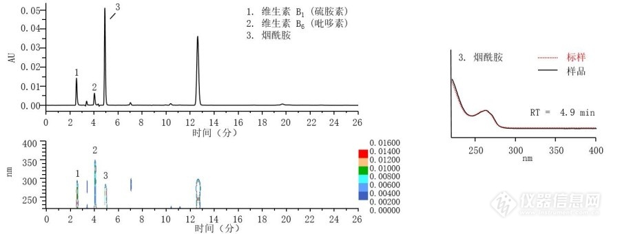 使用二极管阵列检测器(简称:DAD),除了色谱图外,还可获得光谱图,两者结合可排除仅通过色谱保留时间定性造成的假阳性峰,能对食品和其他含有大量杂质的样品进行精确有效的分析。