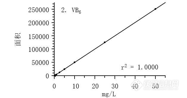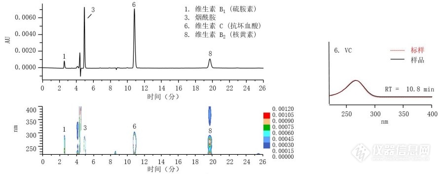 该方法可同时检测多种水溶性维生素,标准曲线线性良好。借助二极管阵列检测器,可对食品和其他含有大量杂质的样品进行精确有效的分析,排除假阳性性峰的干扰。由于维生素C和异抗坏血酸不稳定,在样品制备过程中或随着时间的推移,二者容易发生分解,因此难以获得良好的线性和重现性。所以,此方法适用于定量分析,在定量分析时,建议对各维生素单独测定。