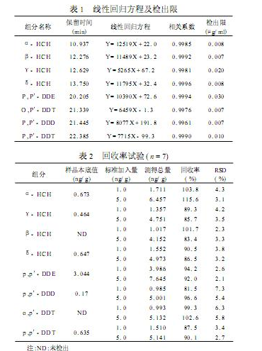 2. 1 线性范围与检出限 用正己烷将100μg/ ml 的储备液分别稀释成不同质量浓度的标准溶液进行实验,并绘制标准曲线,试验结果表明,被测组分质量浓度在0. 01~5. 00μg/ ml的范围内与其色谱峰面积呈线性关系。HCH 和DDT 8 种组分的线性回归方程、相关系数及方法检出限(S/ N = 3) 见表1