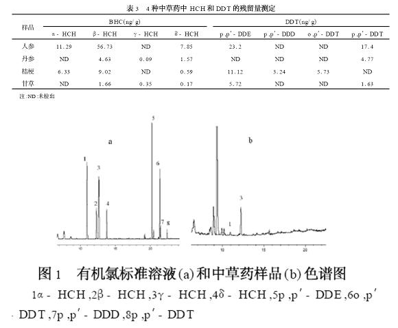 本文建立了4 种植根类中草药中8 种有机氯农药残留的气相色谱测定方法,方法操作简便,准确度高。从测定结果看,8 种有机氯农药残留在这四种草药中均有检出。其中β- HCH 含量最高,P , P′- DDD 最低,参考2000 版药典中对黄芪甘草项下对HCHs 和DDTs 的限量标准 ,检测的4 种中草药样品有机氯残留均未超标。