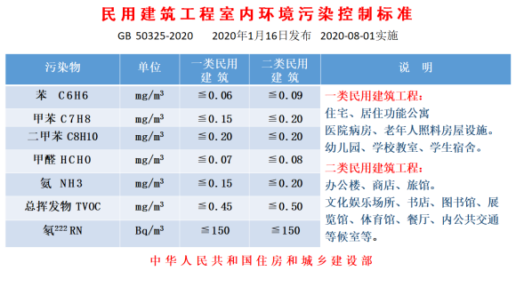 GB 50325-2020《民用建筑工程室内环境污染控制标准》(以下简称新标准)于2020年1月16日经中华人民共和国住房城乡建设部批准发布,自2020年8月1日起实施,原《民用建筑工程室内环境污染控制规范》GB 50325-2010同时废止。国家新标准的制定,重点解决近年来装修和新车空气污染致白血病和癌症等严重疾病危害,重点增加苯系物污染控制标准;标准控制范围共七项,除氡为放射性物质外,其余六项都为具强烈刺激性气味,并且可嗅觉识别化学污染物,其中有三项为苯系物。新标准从控制规范更名为控制标准,说明新标准要求强制执行的特性,体现国家对室内空气污染危害管理的重视,同时对室内环境污染物检测范围和检测标准,亦有具体明确的规范和执行标准。本标准定于2020年8月1号正式执行,详细内容请查阅标准全文。