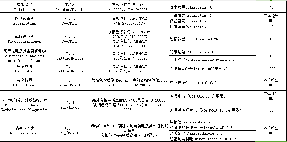 《监控计划》中详细规定了本计划的实施组织、抽检要求、处理结果和工作要求,其附件4《2019年度动物及动物产品兽药残留检测方法及残留限量》中更是对动物及动物产品兽药残留限量做了严格限制。根据附件4内容我们可看出,本次监控计划中设计的仪器主要是高效液相色谱法、液相色谱法、液相色谱-串联质谱法、气相色谱法、气相色谱质谱法等。