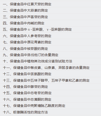 《保健食品卫生学理化检验规范(征求意见稿)》规定了保健食品和原料的卫生学技术要求的检验项目及方法,在该规范的第二部分《二十五种功效成分和标志性成分检验方法》中,规定了用液相色谱、高效液相色谱、气相色谱、紫外/可见分光光度计检测仪器检测红景天、大蒜素等物质的方法;第三部分《十一种溶剂残留的测定》中则规定了甲醇、正丁醇、异丁醇、氯仿、正己烷、甲苯、对二甲苯、邻二甲苯、苯乙烯、1,2-二乙基苯和二乙烯苯11种溶剂残留的气相色谱测定方法。