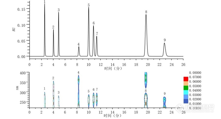 图1. 9种水溶性维生素标准品的色谱图(上)和等高线图(下)