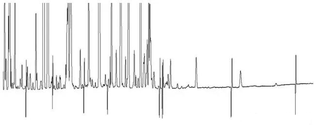 FID出负峰的常见原因是系统污染或者气源问题,但是在看到色谱图之后,发现情况颇有些不同,下面是色谱图: